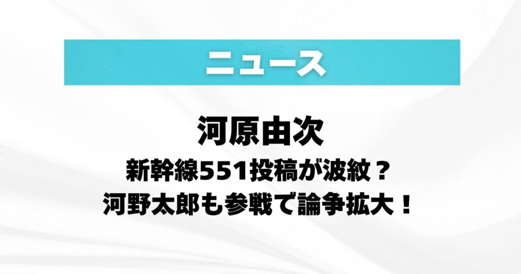 ネクストレベルホールディングスの代表として知られる河原由次さん。 そんな河原さんの新幹線内での「551蓬莱の豚まん」投稿が広がり、車内マナーをめぐる議論に発展しました。 さらに河野太郎さんもXで反応し、話題がもう一段大きくなった形です。 発端と...